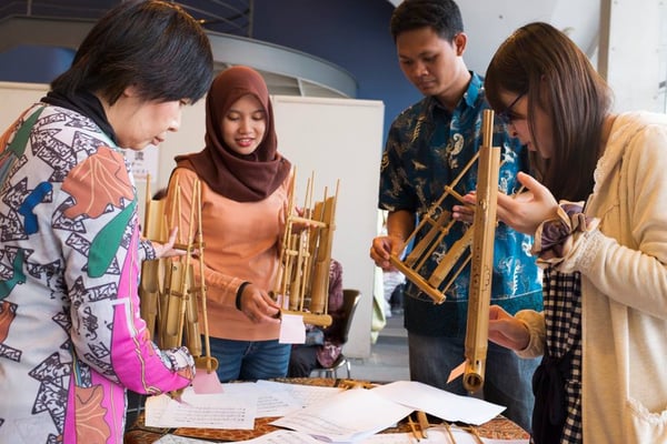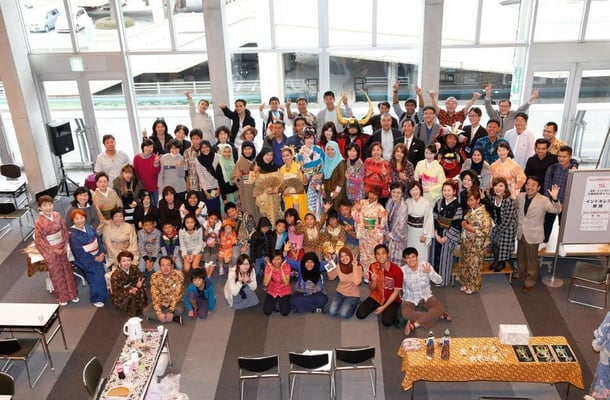 世界の196か国・地域をイメージした着物を制作するイマジンワンワールドKIMONOプロジェクト。インドネシアの着物を担当した久留米市の皆さんのイベントに参加し、留学生のサマン踊りやアンクルンのワークショップを行いました。着物の着付けやお茶のふるまいがあり、賑やかな文化交流会となりました。